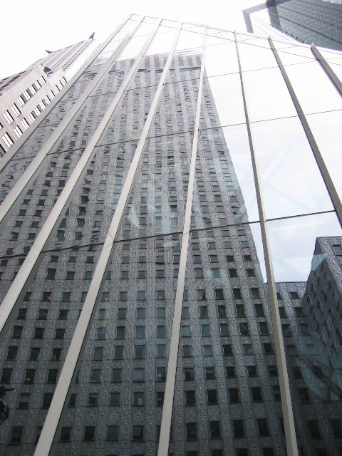 Reflection of a building in a building. If you look up to the left, you can see the gargoyles on the Chrysler Building.