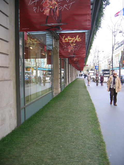 This is in front of Galleries Lafayette...an expensive department store. Yes, that is grass on the sidewalk.