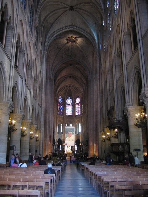 Inside Notre Dame where many people came to pray for the Pope, who had just passed away.